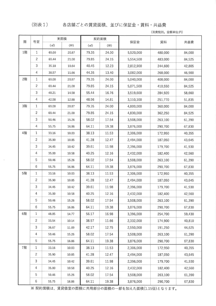 2年定期借家契約 、(設備)、電気・共用WC・共用給湯・光回線、EV2基(11人乗)、EV人荷用1基(13人乗)、電気設備:各店舗までの配管(電灯・動力・弱電設備)(BGM・有線は個別対応)、B1F:駐輪場・6F:喫煙室、火災保険:要加入・保証会社:要加入、契約面積は貸室借室面積に共用部分の面積の一部を加えた面積(1.15倍)となります、用途地域:商業地域、【賃料等は消費税込み】